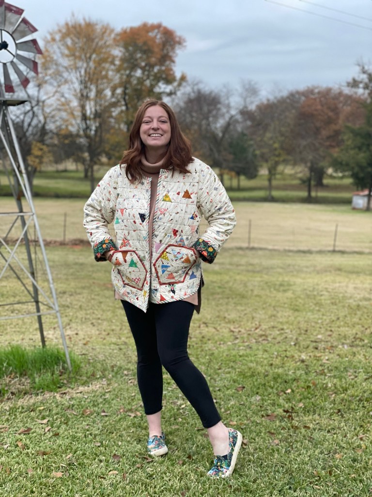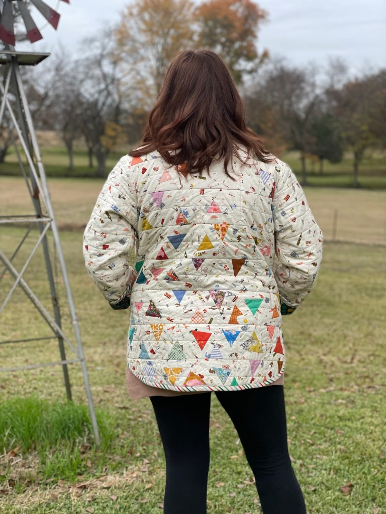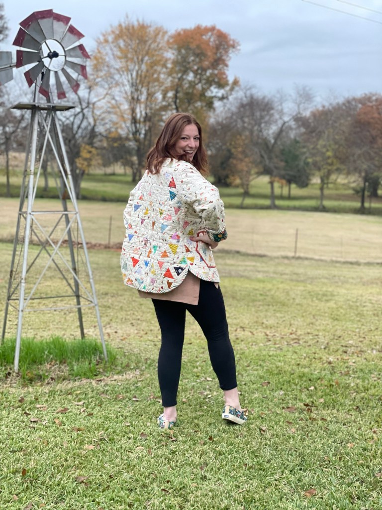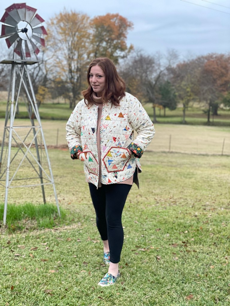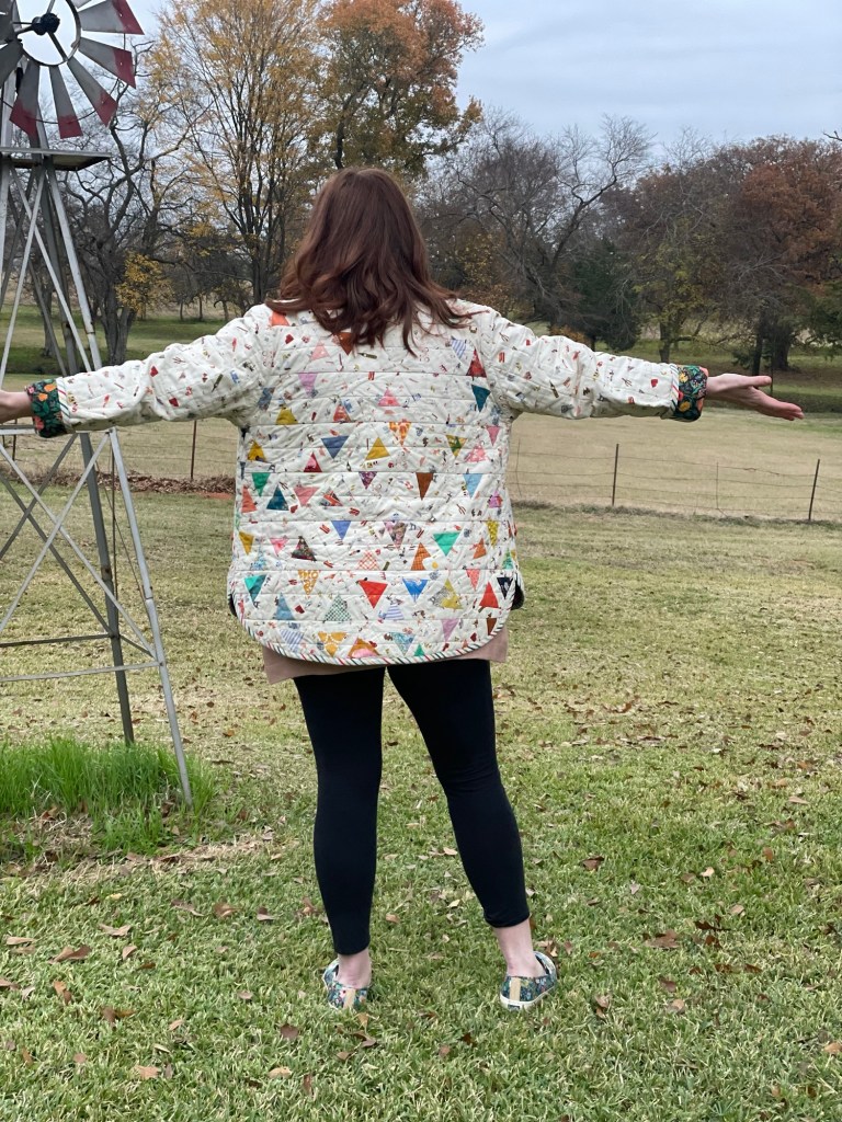 Making the jacket myself was better than purchasing as I was able to use fabrics that I absolutely love. So this quilted coat is a love letter to myself from many of my past projects as the fabrics in this were from quilts made in the past.