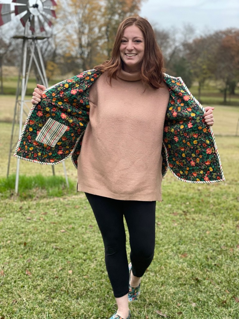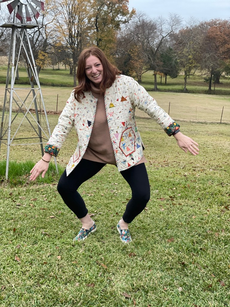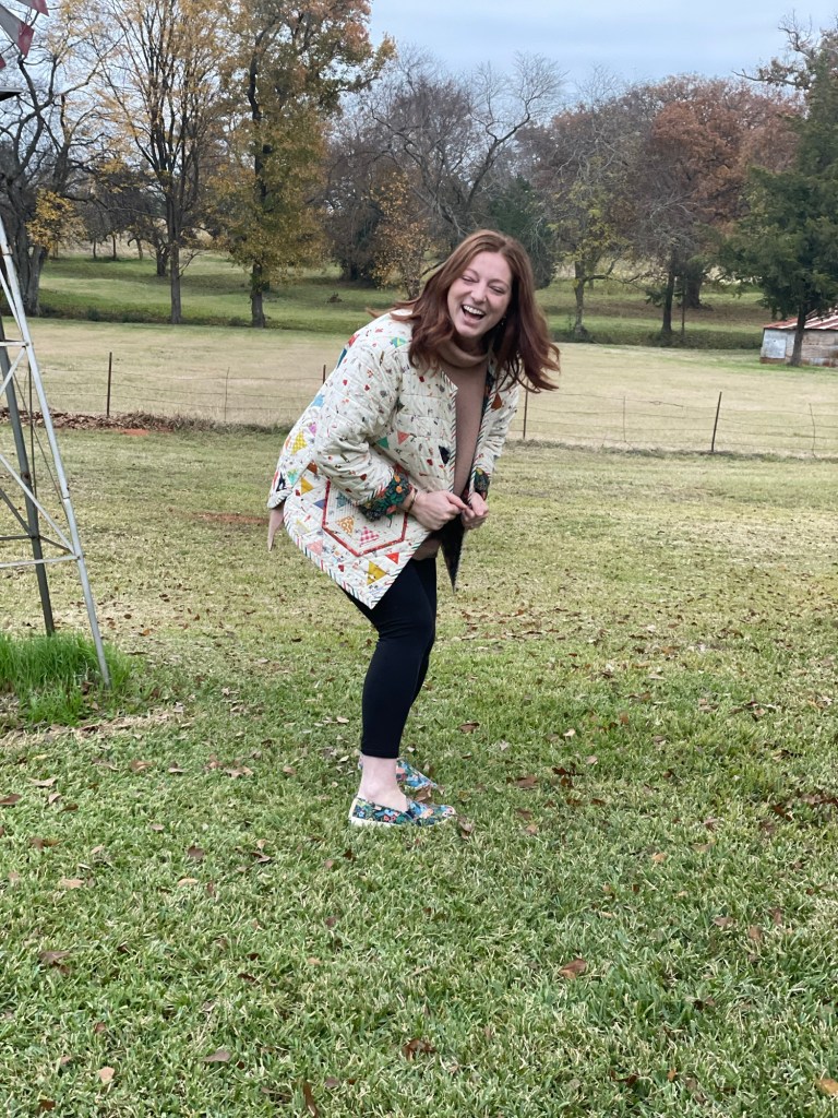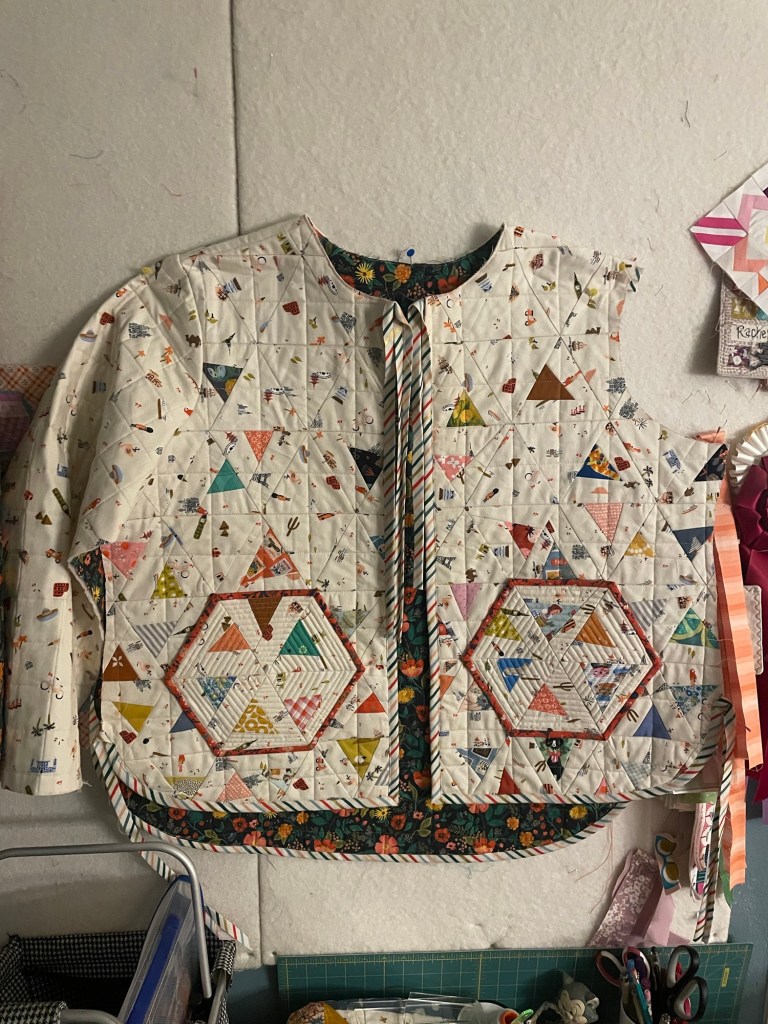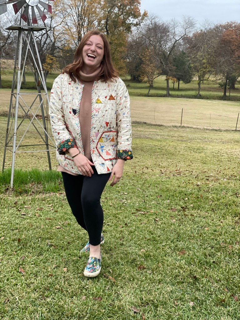 Making the jacket myself was better than purchasing as I was able to use fabrics that I absolutely love. So this quilted coat is a love letter to myself from many of my past projects as the fabrics in this were from quilts made in the past.